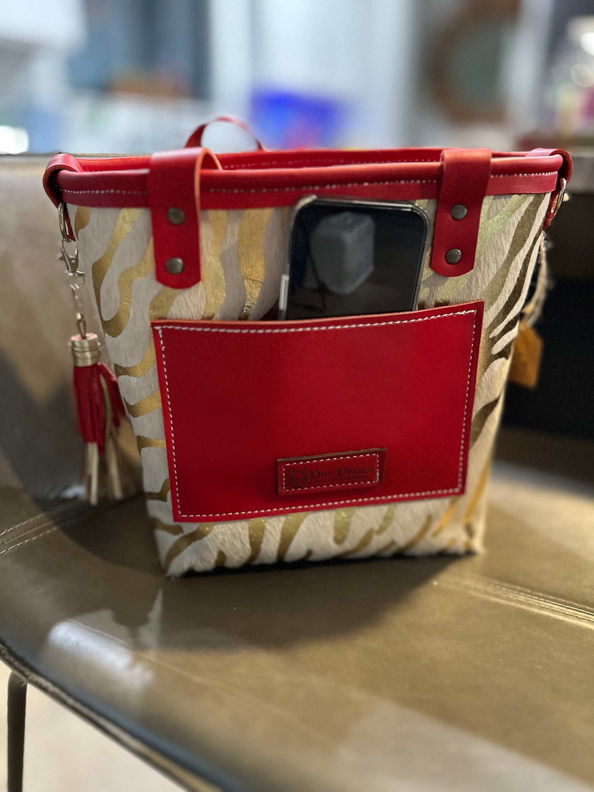 Small Leather Tote Bag - Red/White/Gold